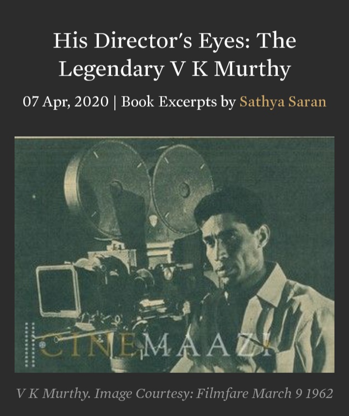 He worked as an Assistant to Cinematographer V. Ratra film “Baazi” in 1951 which was directed by Guru Datt. Datt noticed the fluidity and flow that Murthy managed in a particular shot. A pan from a reflection in the mirror to Dev Anand to Geeta Bali and the Chorus rendering ‘Suno Gazar Kya Gaye’. Datt impressed to take him on for “Jaal”(1952). Jaal was Murthy’s first film as a chief cinematograer. Murthy then became a part of the Guru Datt Team. Murthy became Guru’s favorite and this duo shared a unique bond with each other, which lasted until Guru Datt’s last breath.