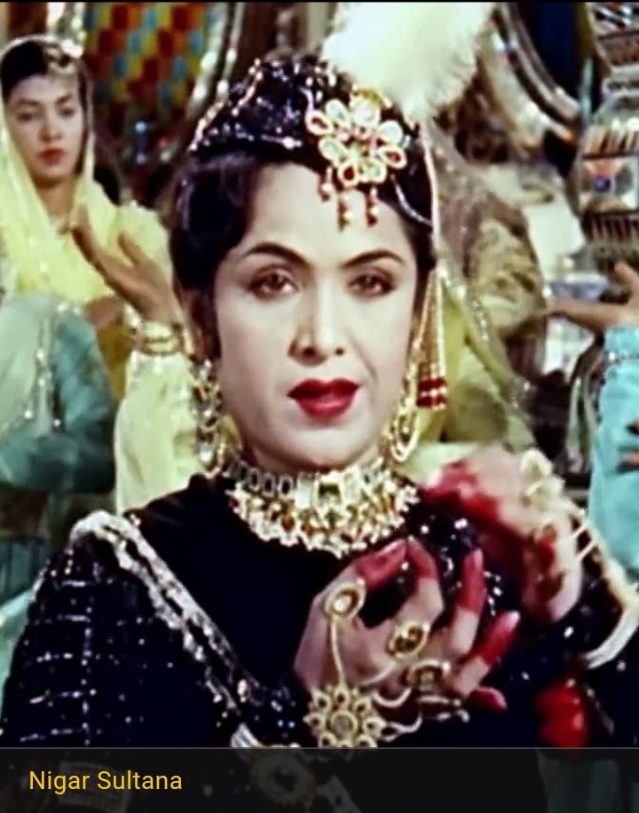 She is mainly remembered for the role of the court dancer jealous Bahar, who wants the Prince Salim (Dilip Kumar) to love her so that she may one day become queen. Unsuccessful in winning Salim’s love, she exposes his forbidden relationship with Anarkali (Madhubala) in the film Mughal-e-Azam (1960). Nigar had two songs pictursed her in this film, namely Teri mehfil mein and jab raat ho aisi matwali.