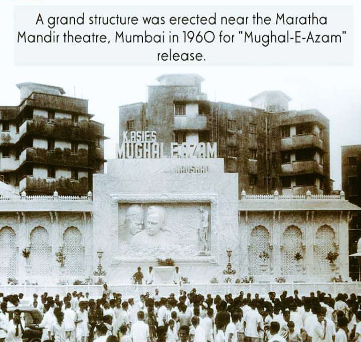 The premiere of Mughal-e-Azam was held at the then-new 1,100-capacity Maratha Mandir cinema in Mumbai. Mirroring the nature of the film, the cinema’s foyer had been decorated to resemble a Mughal palace, and a 40-foot (12 m) cut-out of Prithviraj Kapoor was erected outside it. The Sheesh Mahal set was transported from the studio to the cinema, where ticket holders could go inside and experience its grandeur. Invitations to the premiere were sent as “royal invites” shaped like scrolls, which were written in Urdu and made to look like the Akbarnama, the official chronicle of the reign of Akbar. The premiere was held amidst great fanfare, with large crowds and an extensive media presence, in addition to hosting much of the film industry. The film’s reels arrived at the premiere cinema atop a decorated elephant, accompanied by the music of bugles and shenai.