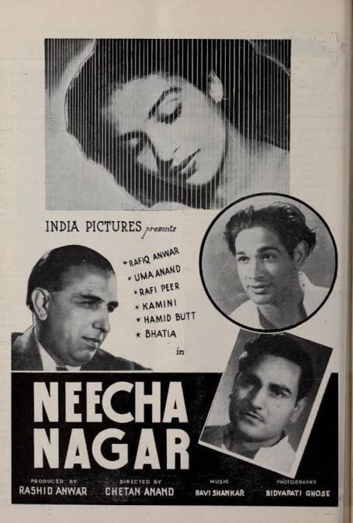 The film stars Uma Anand (Chetan Anand’s wife) in the lead role, alongside Rafiq Anwar, Kamini Kaushal, Murad, Rafi Peer, Hamid Butt, and Zohra Sehgal. Neecha Nagar is an Indianized Hindi adaptation of Russian writer Maxim Gorky’s 1902 play The Lower Depths, re-imagined to suit Indian social conditions.